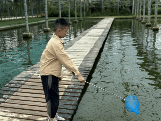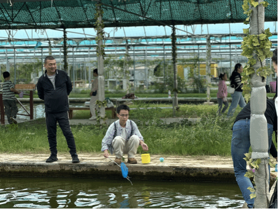 莲塘边,教师们小心翼翼地采摘着成熟的莲蓬,享受着劳动的快乐,分享着劳动的成果。孩子们则在一旁的水池边专注地捞鱼,每当捞到一条小鱼,就会兴奋地向展示自己的“战利品”。