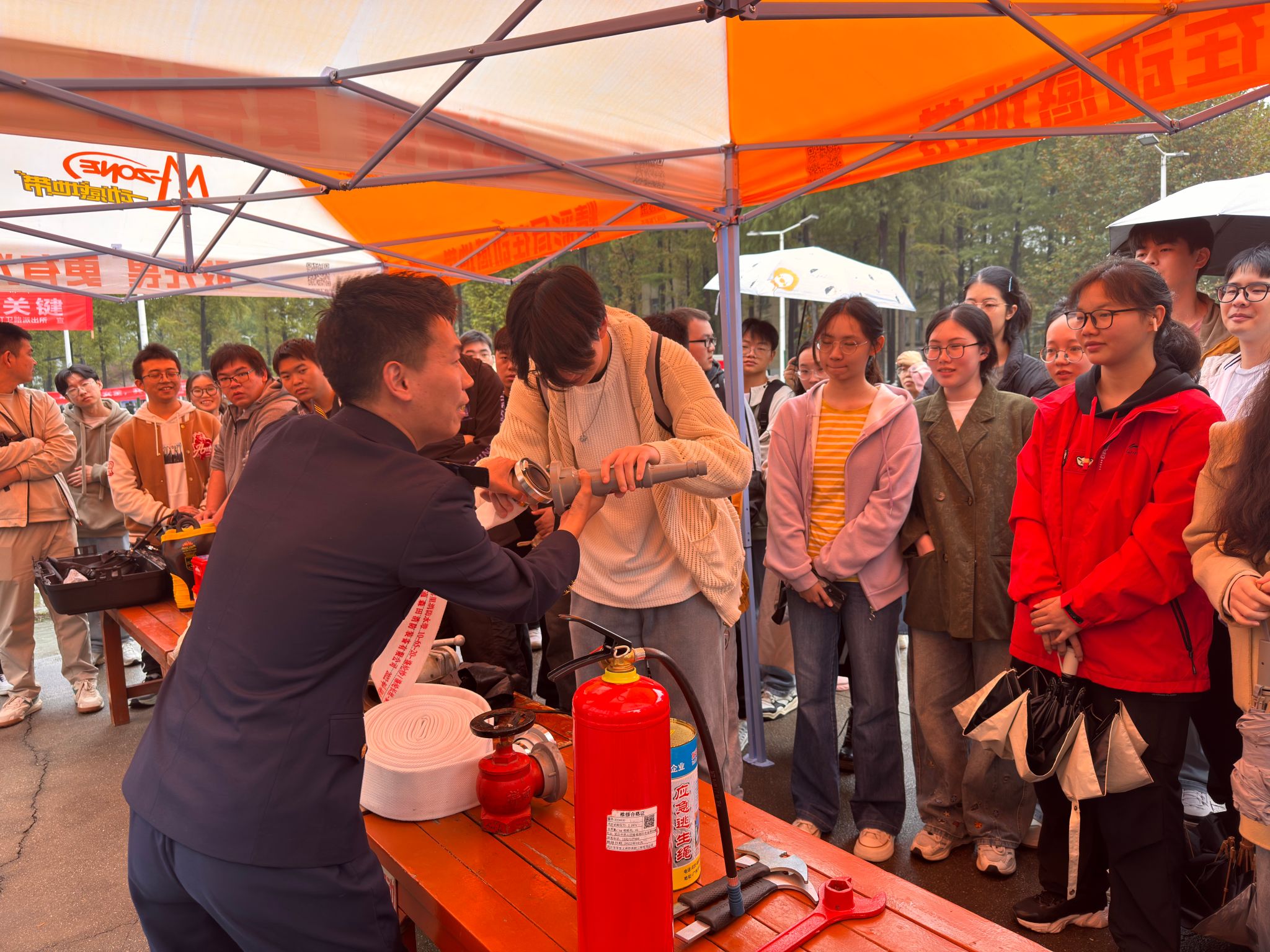 活动现场,消防器材展示区各类装备整齐陈列,成为师生关注焦点。消防救援人员重点展示干粉灭火器、二氧化碳灭火器等不同类型灭火器材,详细解读各类器材适用场景。同时,灭火毯、消防水带、应急照明设备、防烟面具等常用装备逐一亮相,消防人员现场演示防烟面具佩戴流程,强调其在火场逃生中的关键作用,帮助师生建立对消防装备的全面认知。