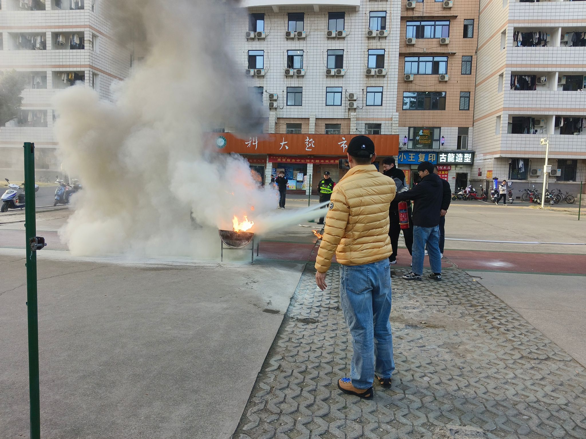 疏散集结完毕后,师生们移步至消防演练区,进入演练的第二阶段——消防器材实操培训。保卫处专业人员详细讲解并演示了干粉灭火器的正确使用方法,精炼概括为“提、拔、握、压”四个步骤,并辅以“提拔我呀”的谐音梗帮助记忆,生动形象。在随后进行的实操环节中,师生们积极参与,两人一组,提着灭火器,轮番上阵,面对点燃的油桶火焰,沉着冷静地按照操作要领成功将火扑灭,亲身体验了初期火灾的扑救过程。