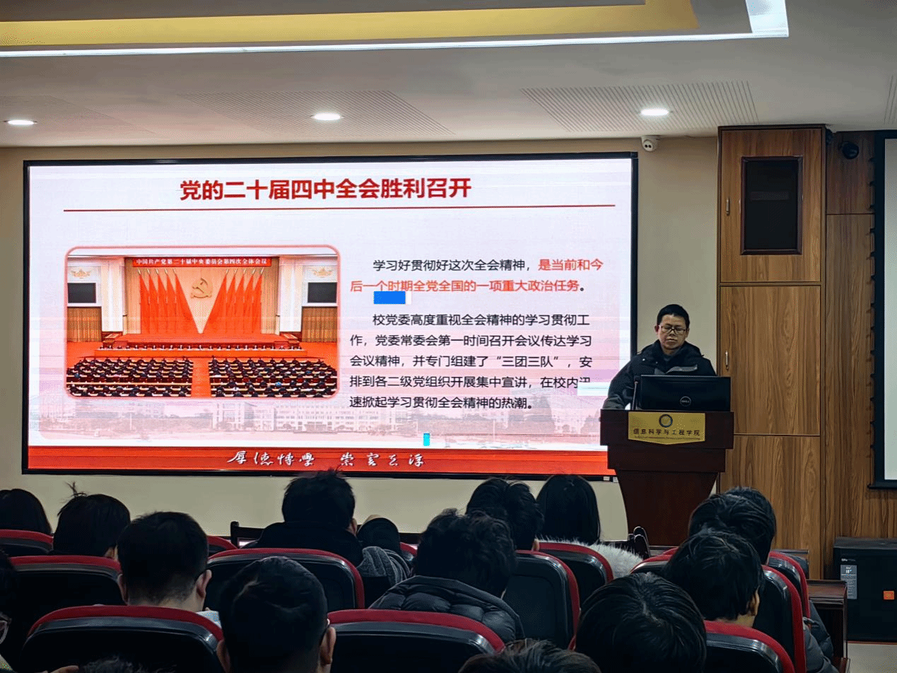 (通讯员谢炜 徐诗亮)为推动干部师生全面学习、全面把握、全面落实党的二十届四中全会精神,12月4日,英国上市公司官网365“双带头人”专题宣讲会在青山校区教十楼四楼会议室顺利举行。